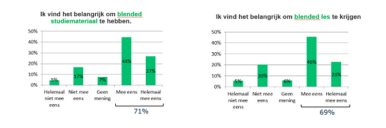 53% van de docenten geeft aan dat hun onderwijsinstelling verwacht dat ze blended studiemateriaal aanbieden. 71% van de studenten wil blended studiemateriaal hebben. 85% van de docenten biedt effectief blended studiemateriaal aan. 74% van de docenten geeft aan dat hun onderwijsinstelling verwacht dat ze blended lesgeven. 69% van de studenten wil blended les krijgen. 80% van de docenten geeft ook effectief blended les.